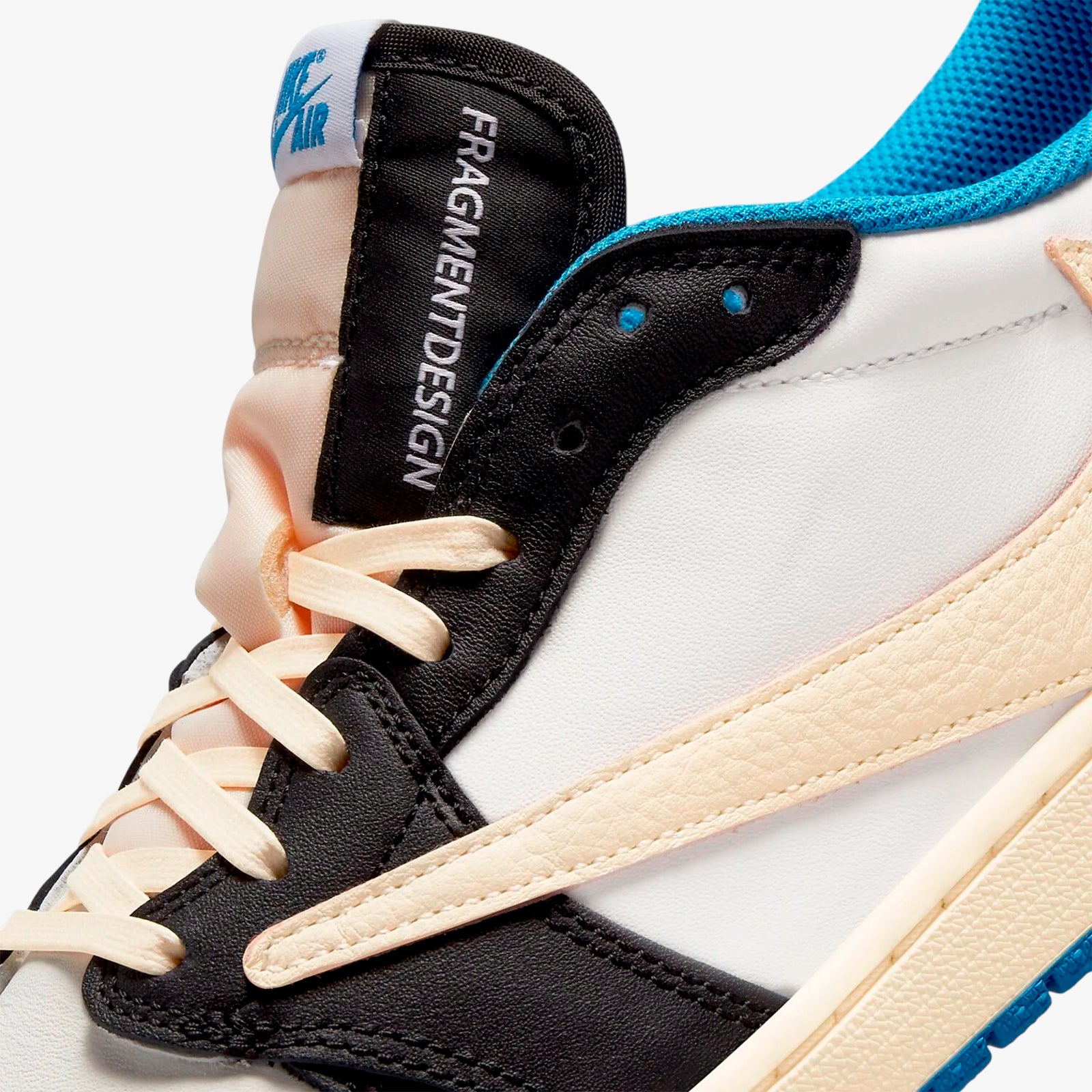 The Jordan 1 Retro Low OG SP Fragment x Travis Scott is a distinctive collaboration that merges the aesthetics of Travis Scott and the renowned Fragment Design by Hiroshi Fujiwara. It features a clean colour palette of white, black, royal blue, and sail, blending classic block colours with unique details such as the reversed Swoosh in sail tone. The sneaker’s upper combines smooth leather panels, presenting a sleek, modern interpretation while paying homage to the original 2016 Fragment Jordan 1.