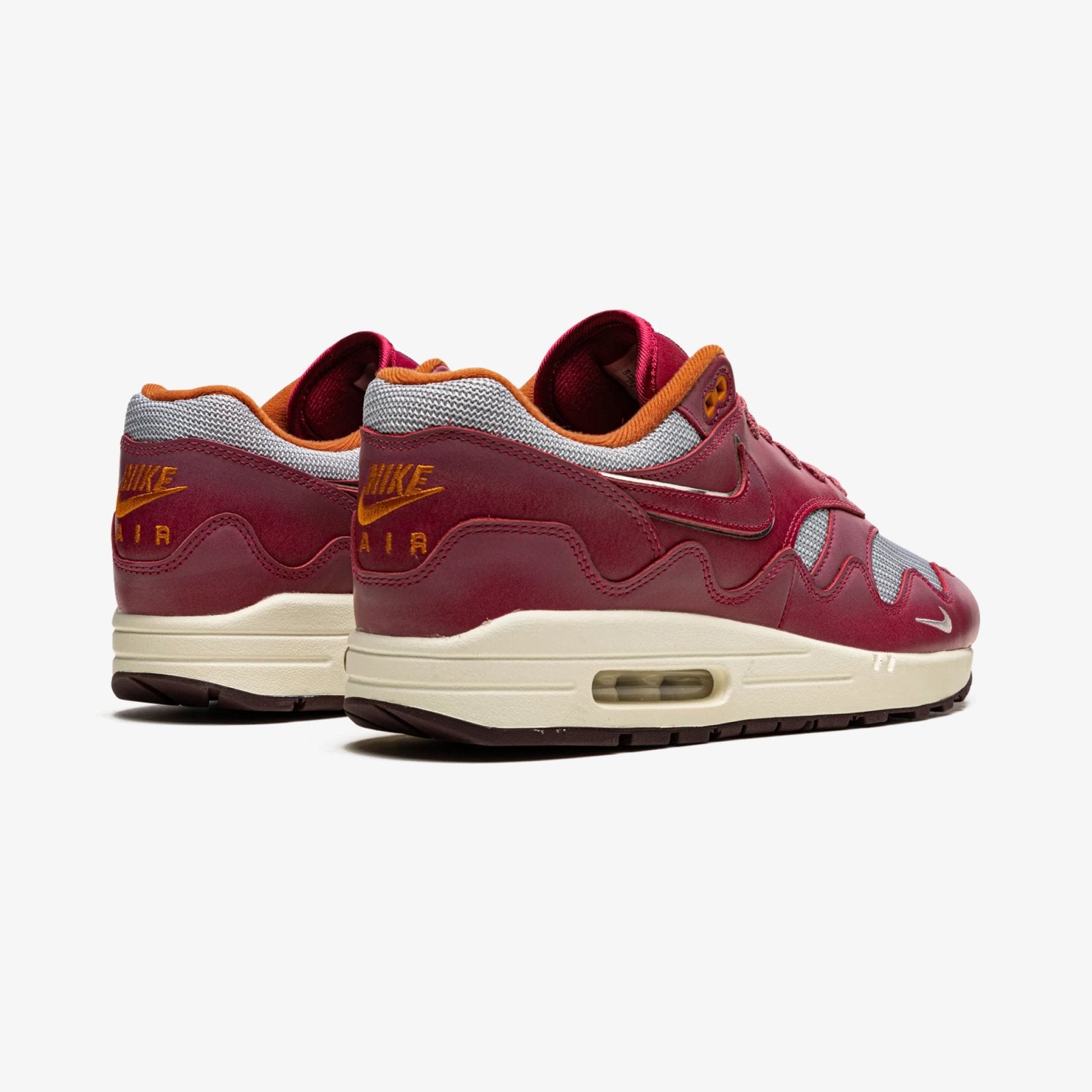 The Nike Air Max 1 Patta Waves Rush Maroon, part of the "Waves" series released in November 2021, is a creative collaboration with Amsterdam-based streetwear brand Patta. This special edition features premium leather in a rich rush maroon tone complemented by silver mesh panels that enable breathability and add visual contrast. Distinctive wavy overlays symbolize Patta’s dynamic street culture influence, while orange detailing on the eyelets, collar, and branding complete the autumnal colour palette.