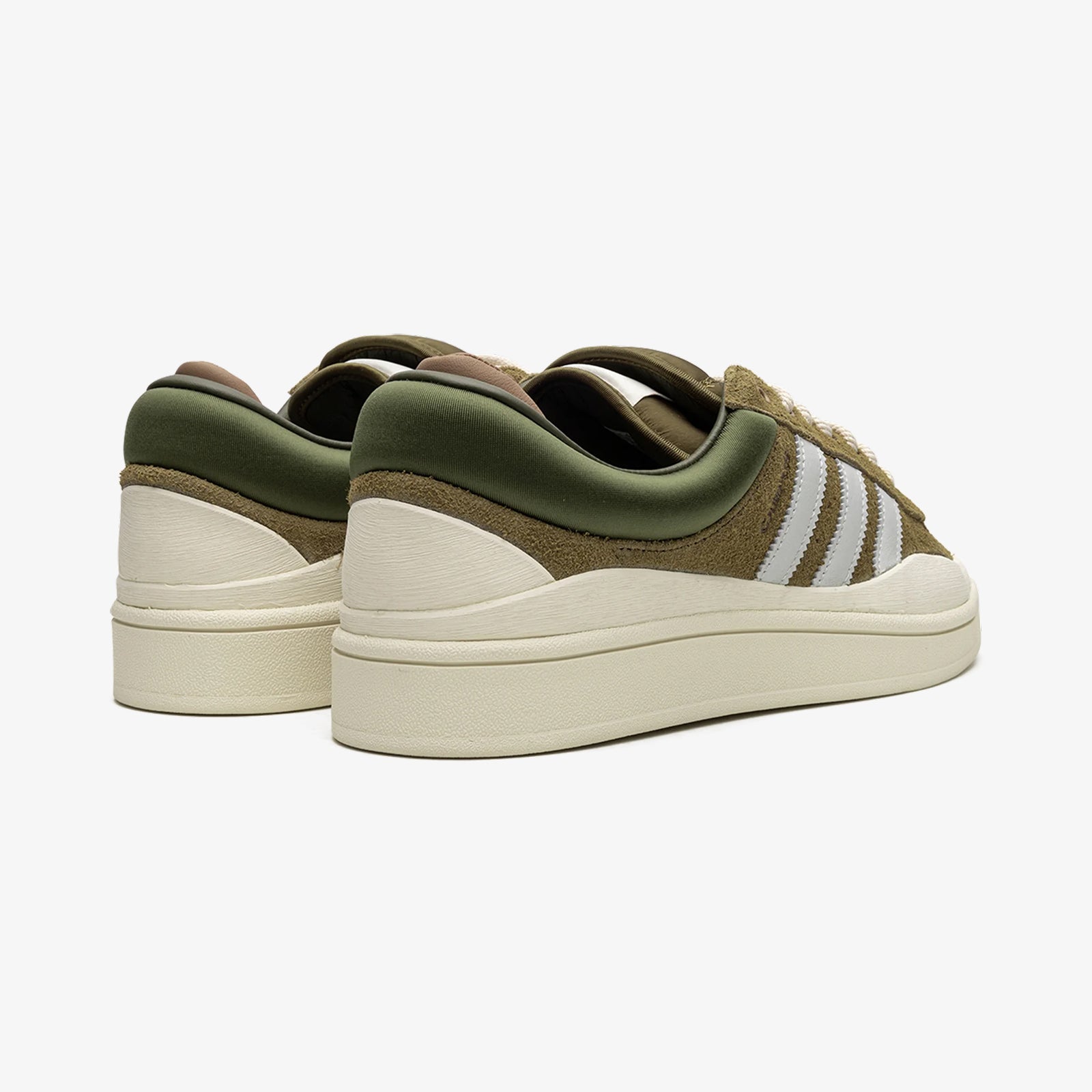 The adidas Campus Light Bad Bunny Wild Moss, released in April 2023, is a fresh collaboration that brings together the heritage of the classic Campus Light with the bold personality of music icon Bad Bunny. This edition features a unique combination of olive green suede and nylon, accented with darker green padded collars and off-white rope laces that add a tactile and visual contrast. The shoe's silhouette is further enhanced by the double-stacked tongues showcasing Bad Bunny’s signature eye icon and the classic adidas trefoil logo, symbolising the fusion of culture and sport.