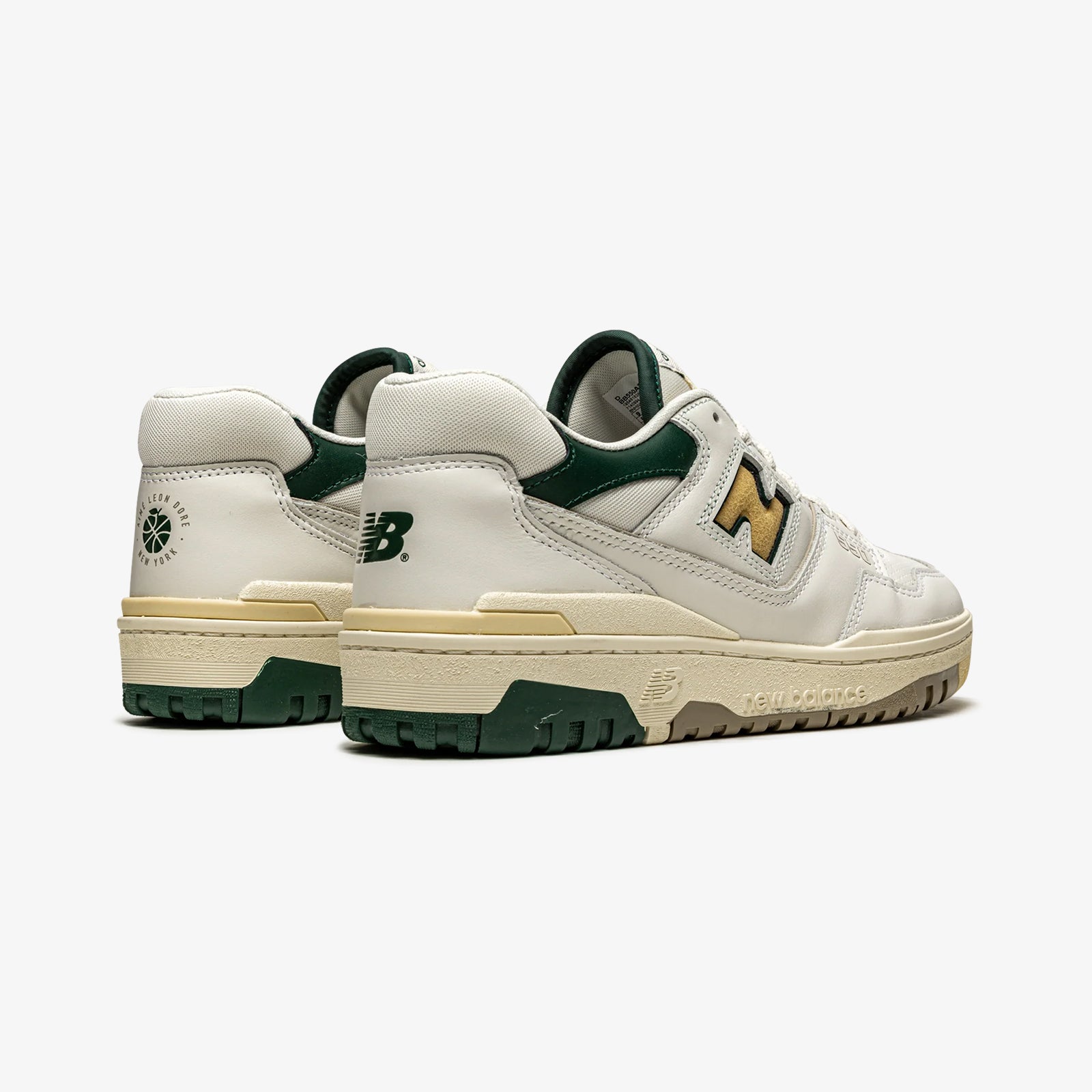 The New Balance 550 Aimé Leon Dore Natural Green embodies a perfect balance between vintage sport design and refined contemporary craftsmanship. Reviving the retro basketball silhouette originally released in 1989, Aimé Leon Dore and Teddy Santis reinterpret the model with a minimalist yet nostalgic aesthetic. The shoe features a premium white leather upper accented by forest green touches across the collar, heel, and outsole, while the golden “N” logo on the sides adds a subtle touch of contrast and sophistication.