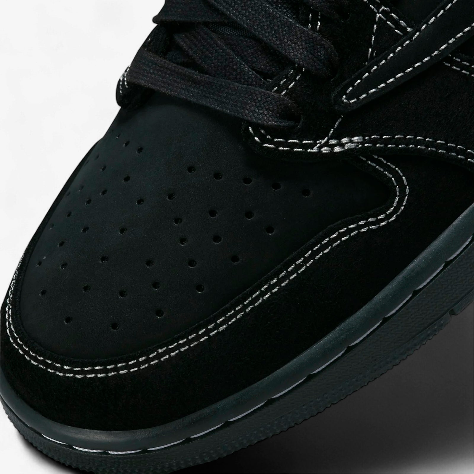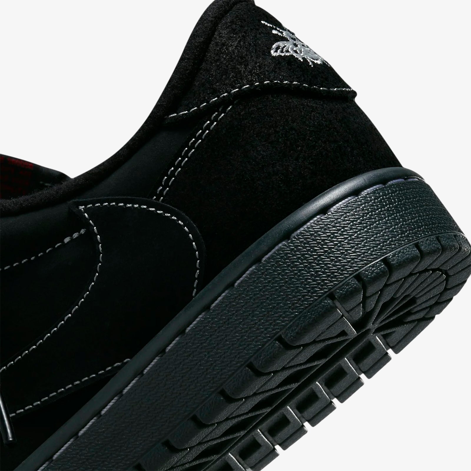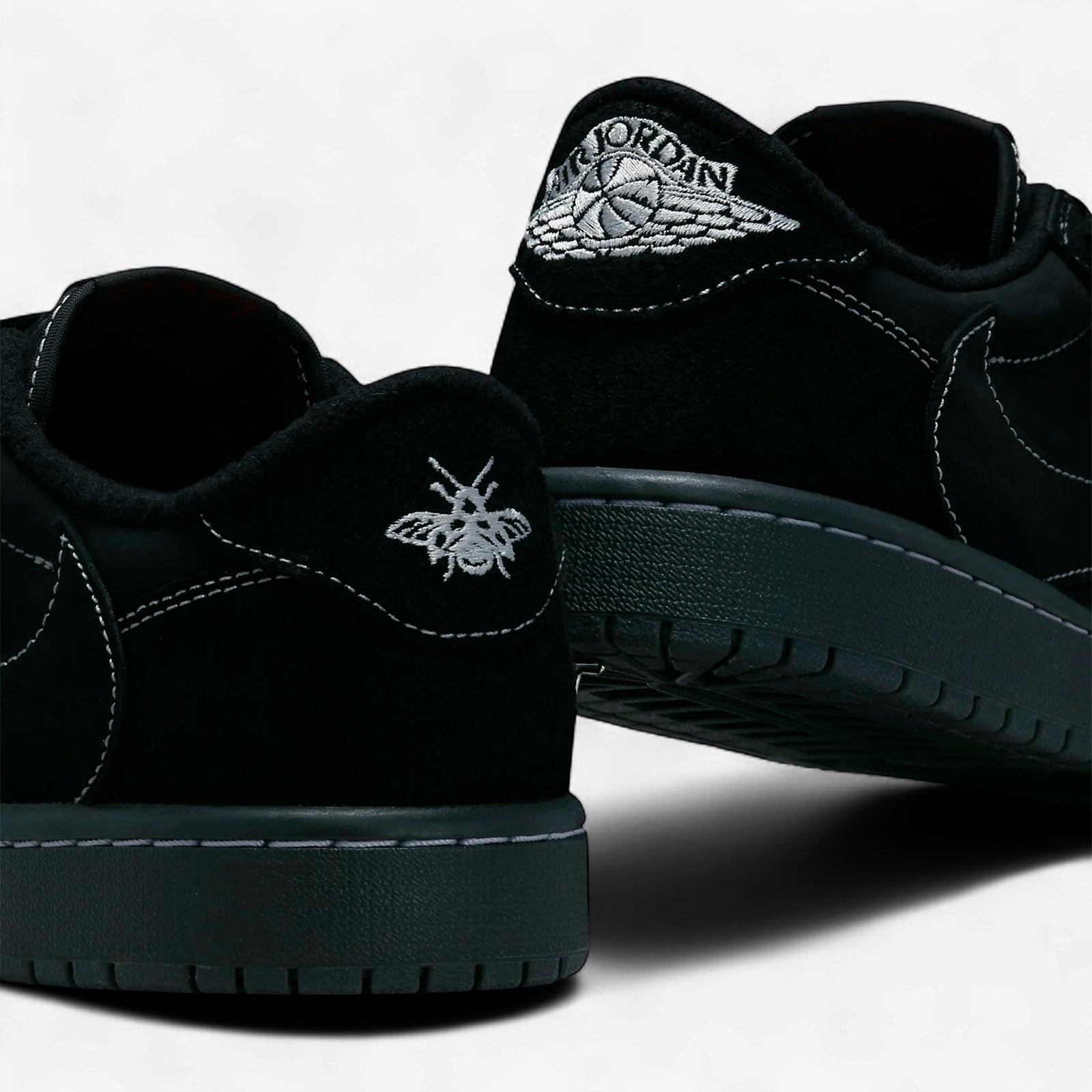 The Jordan 1 Retro Low OG SP Travis Scott Black Phantom delivers a sleek and sophisticated look with a predominantly black design utilising rich nubuck and suede variations. Its minimalistic style is elevated by white contrast stitching and subtle embroidered details, including a bee motif on the heel representing a personal symbol linked to Travis Scott’s daughter. The reversed black leather Swoosh adds a distinct identity to this monochrome edition.