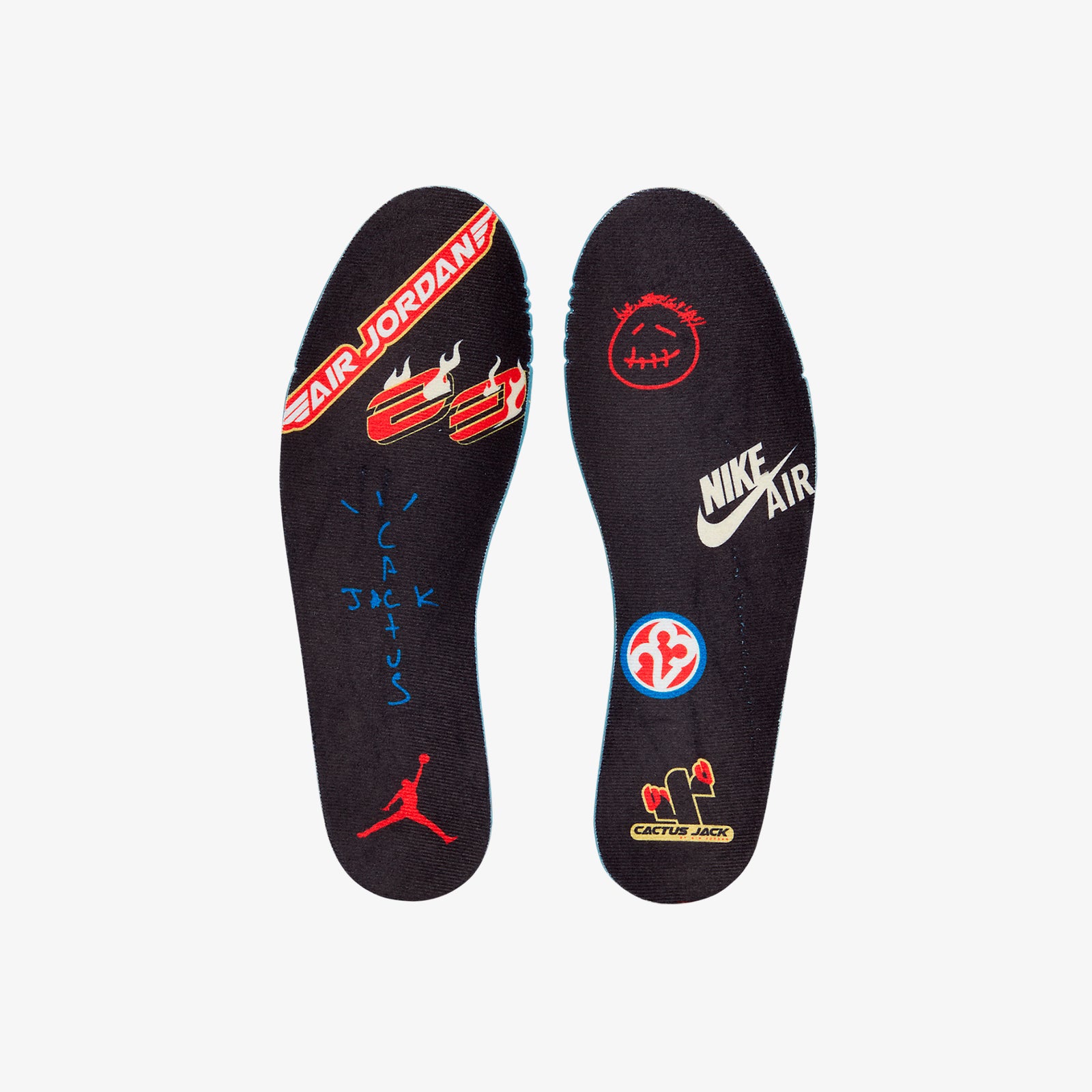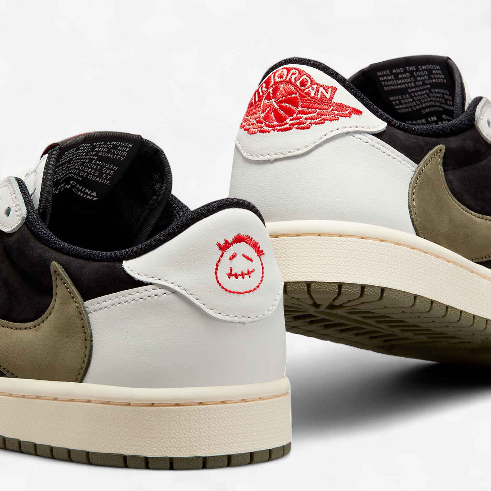 The Jordan 1 Retro Low OG SP Travis Scott Olive is characterised by its understated design combining black nubuck with white leather panels. This pair features a distinctive olive green reversed leather Swoosh that adds a utilitarian accent to the classic silhouette. Red embroidered branding details including the Wings logo and Cactus Jack logos highlight the collaboration’s exclusive identity.