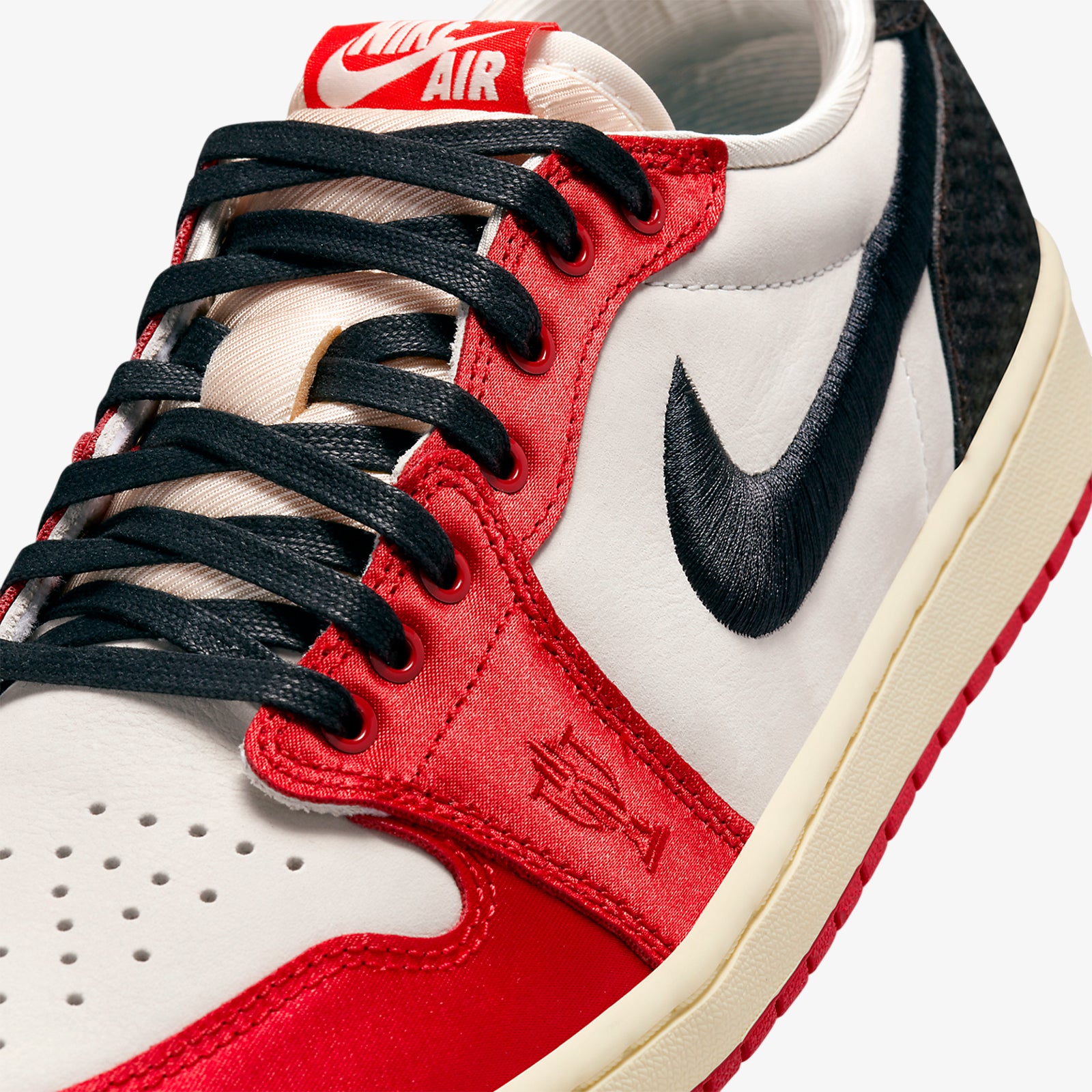 The Jordan 1 Retro Low OG Trophy Room Rookie Card Away is a sophisticated fusion of sport heritage and modern sneaker culture. Inspired by the iconic 1986 Fleer Michael Jordan rookie card, this pair features a reversed "Bred" colourway with a unique palette of sail, black, varsity red, and muslin accents. The upper combines premium leather and satiny materials, creating a luxurious feel while paying homage to classic basketball aesthetics.