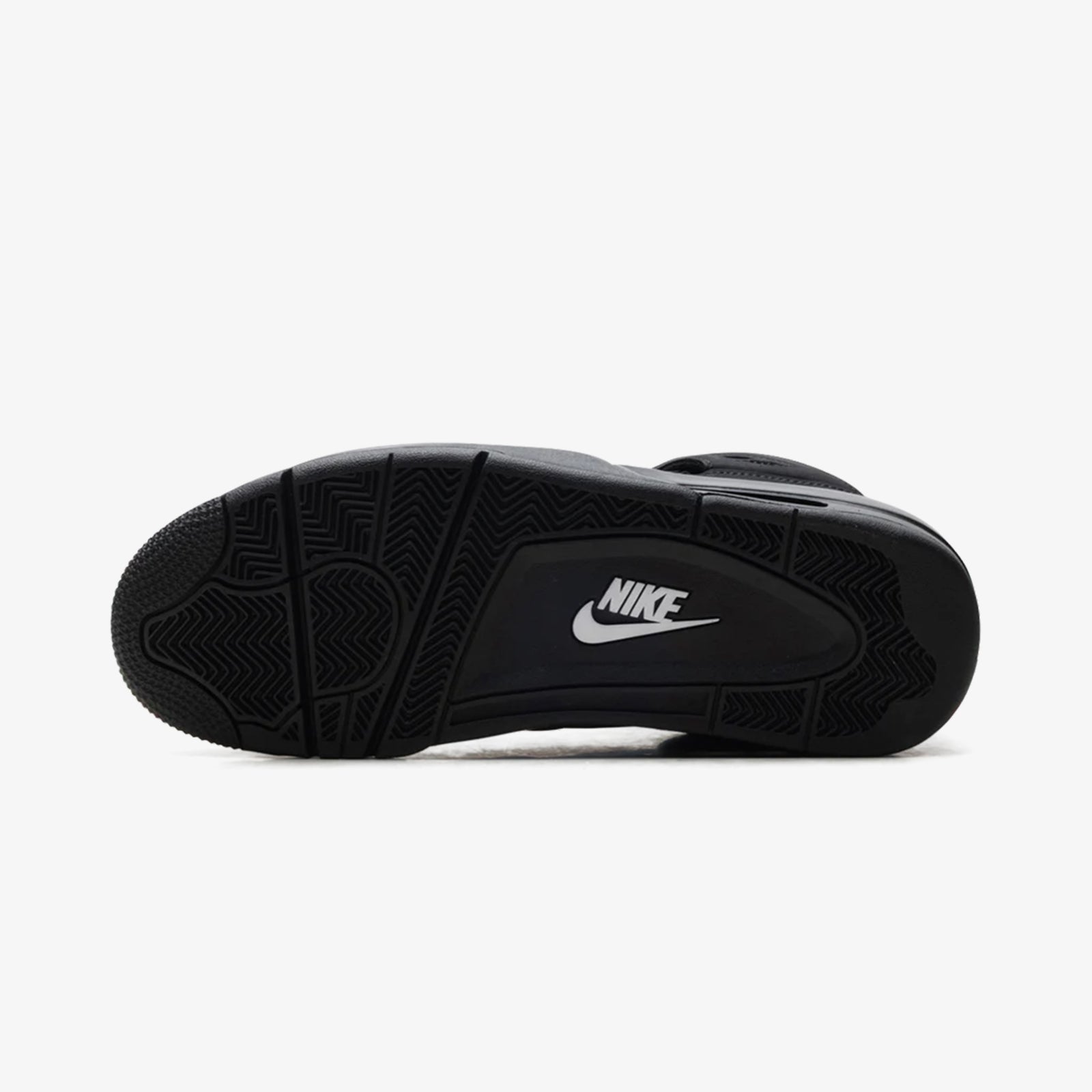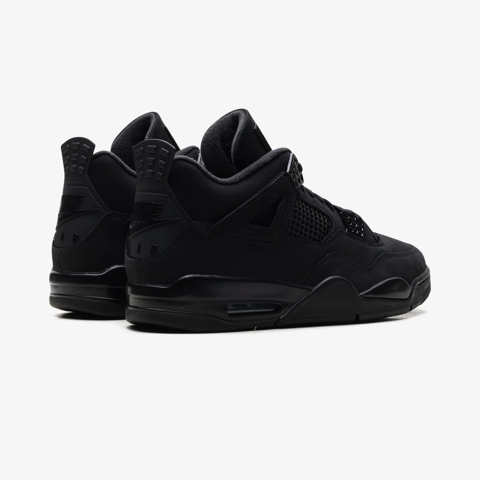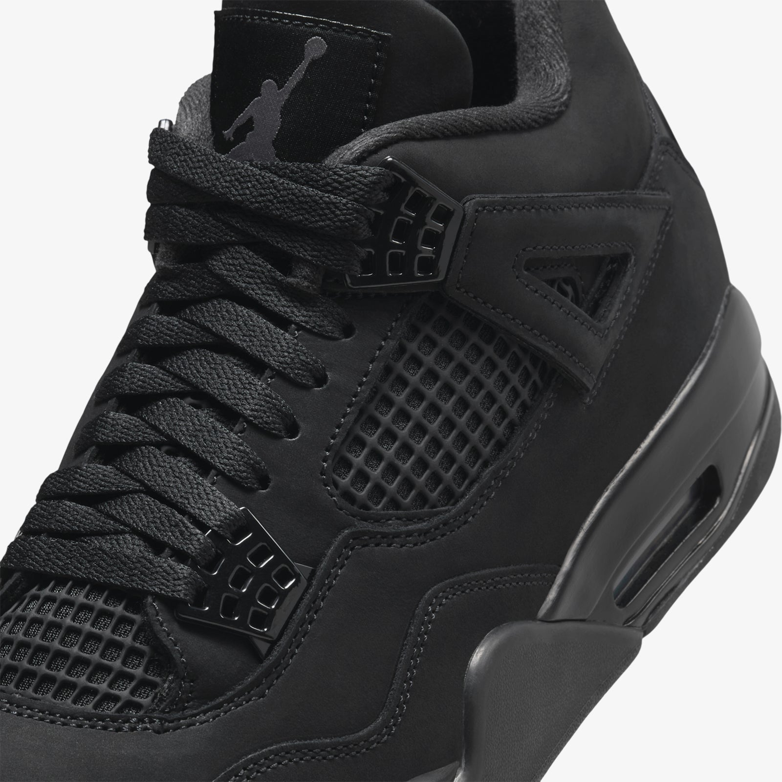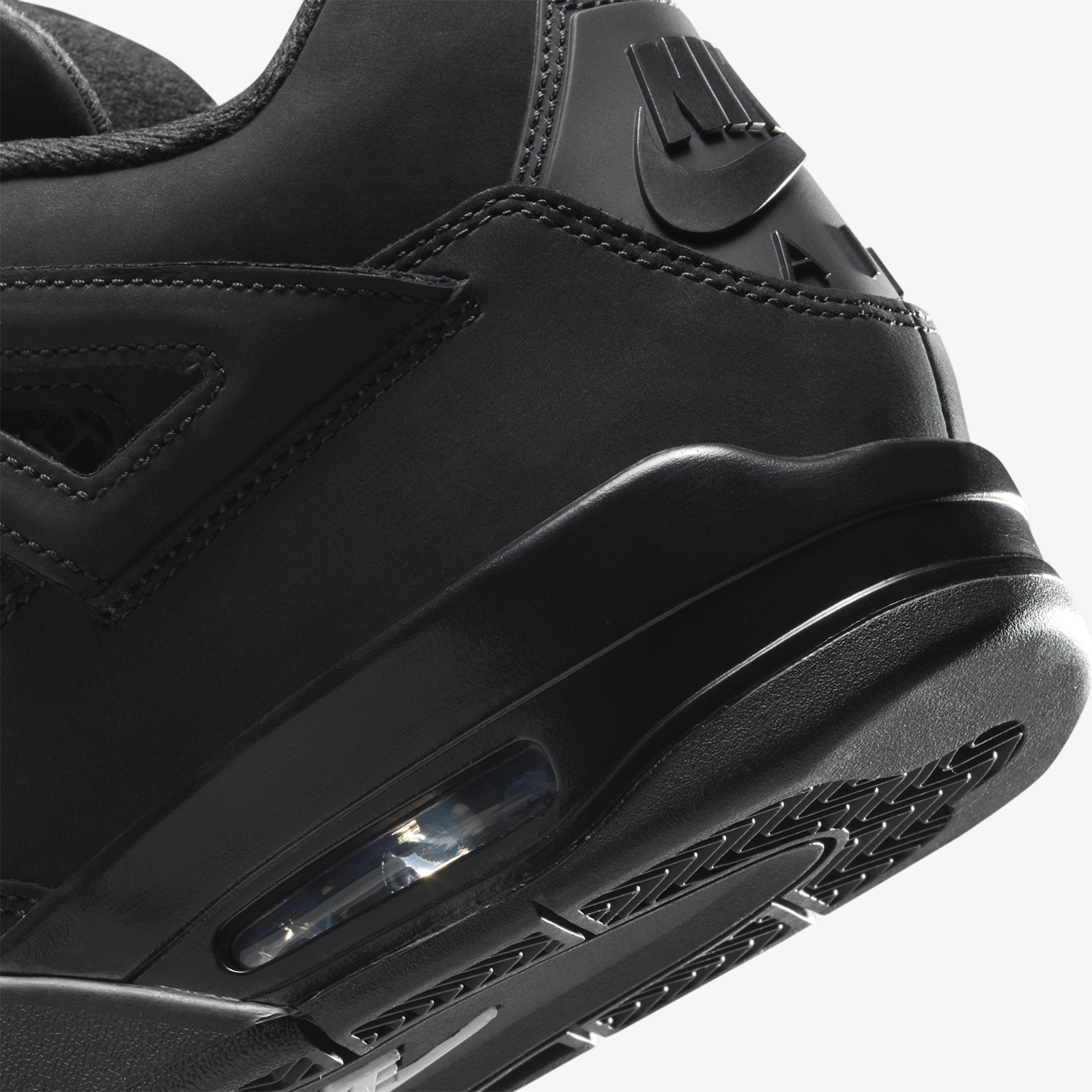 The upper leans into a fully blacked out execution built on premium black nubuck, paired with tonal mesh panels on the quarter and tongue. Plastic wings, eyelets and support pieces are also finished in black, with some pairs noted for slightly glossy hardware that adds depth without breaking the monotone idea. Underfoot, a black polyurethane midsole houses visible Nike Air cushioning in the heel and encapsulated Air in the forefoot, combining a sleek look with classic Jordan 4 comfort.