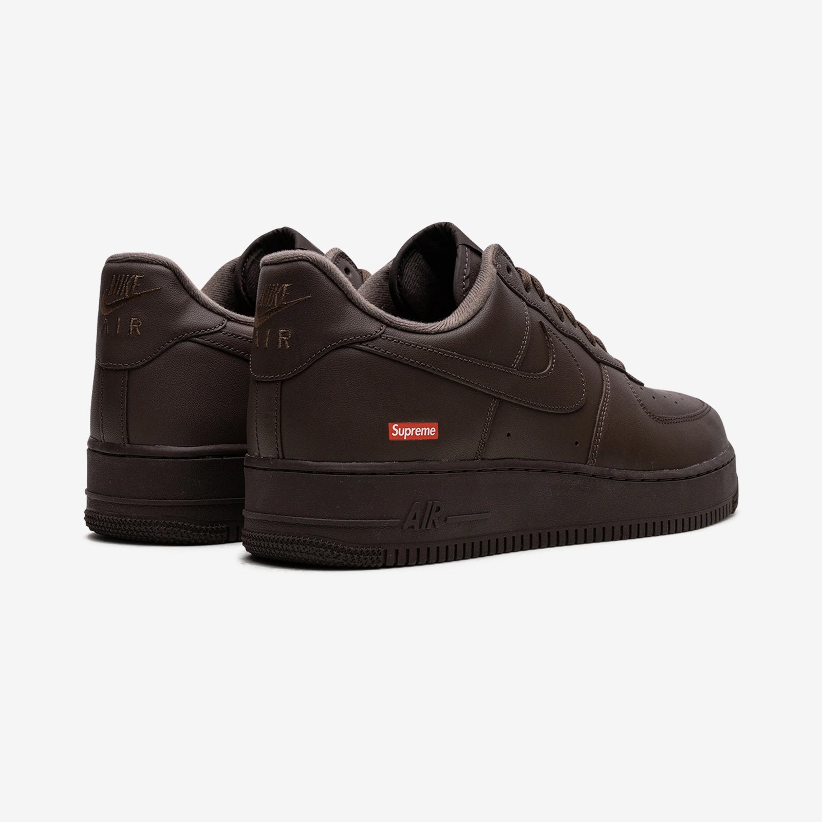 The Nike Air Force 1 Low Supreme Baroque Brown, released in November 2023, is a luxurious collaboration that dresses the classic Air Force 1 Low silhouette in rich, tonal brown leather. This edition features a premium full leather upper in a deep Baroque Brown shade accompanied by a matching rubber outsole and round laces, creating a seamless monochromatic look. Signature Nike details on the sole, heel tab, and tongue enhance the iconic form, while the Supreme box logo on the heel signifies the exclusive partnership.