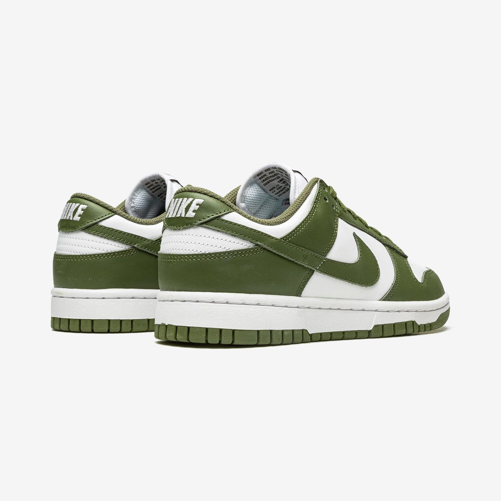 The Nike Dunk Low Medium Olive, released in September 2022, presents a fresh take on the iconic Dunk Low silhouette with a clean two-tone aesthetic. Featuring smooth white leather as a base, this model is accented with olive green leather overlays that extend to the tongue, laces, fabric lining, and outsole. The understated olive tone adds a subtle yet sophisticated character to the sneaker.