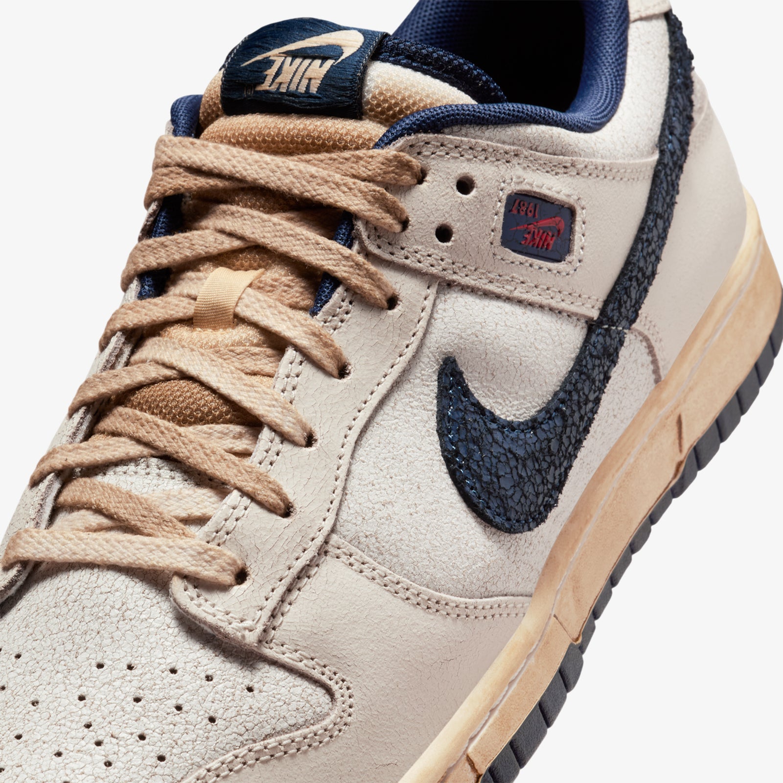 The upper likely combines smooth leather panels with textile or suede accents, using light Phantom tones as a backdrop for contrasting details. A padded tongue and collar keep the familiar Dunk comfort, while the low cut profile preserves that easy, everyday wear the silhouette is known for. Underfoot, a traditional rubber cupsole and foam midsole maintain the classic Dunk feel that connects back to its 80s origins.