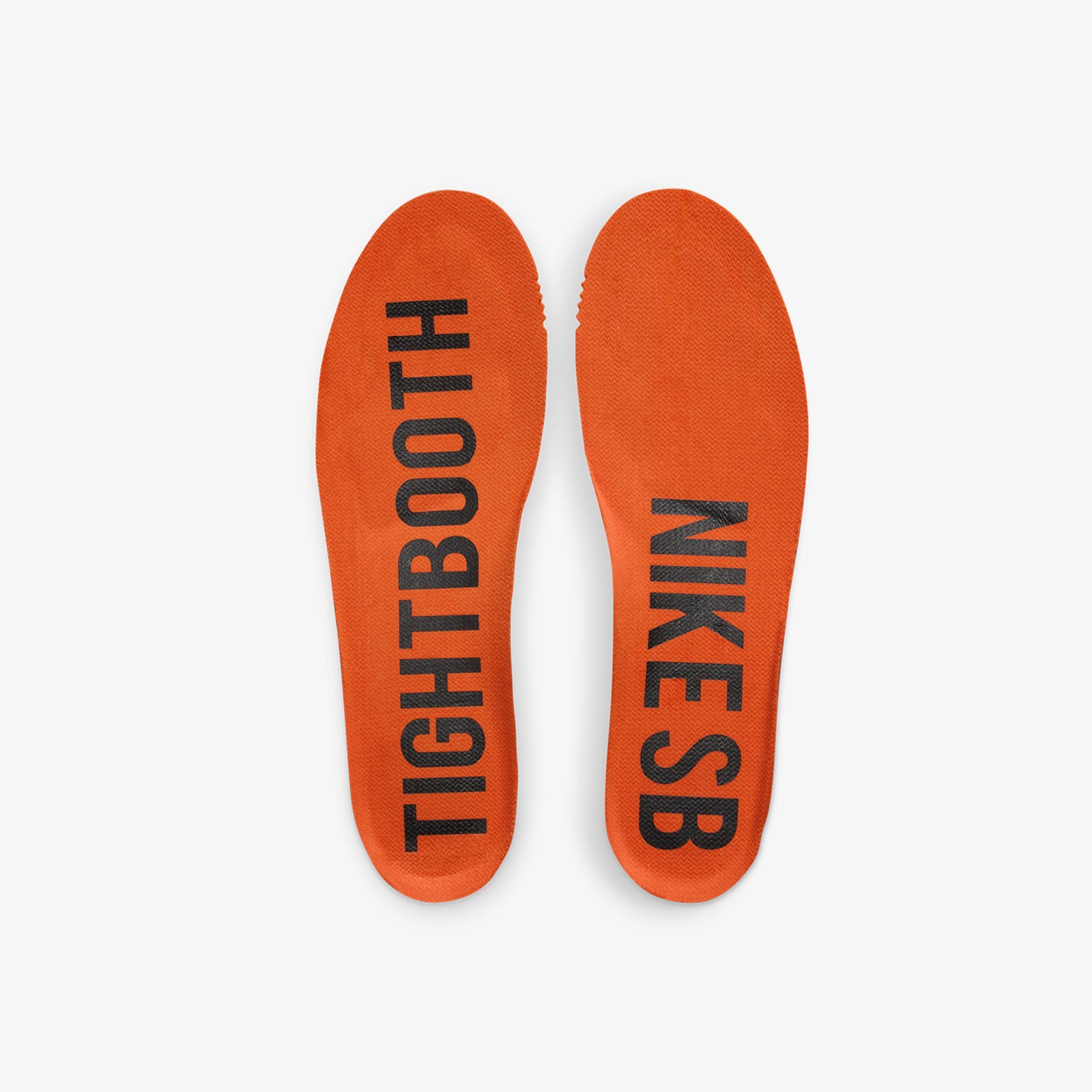 Accents of grey leather and subtle reflective swooshes bring dynamic movement to the design, while bright orange details on woven labels and the sockliner celebrate Tightbooth’s distinctive identity. Multiple co-branded elements on the tongue, insole, and lateral label provide a sense of authenticity and exclusivity.
