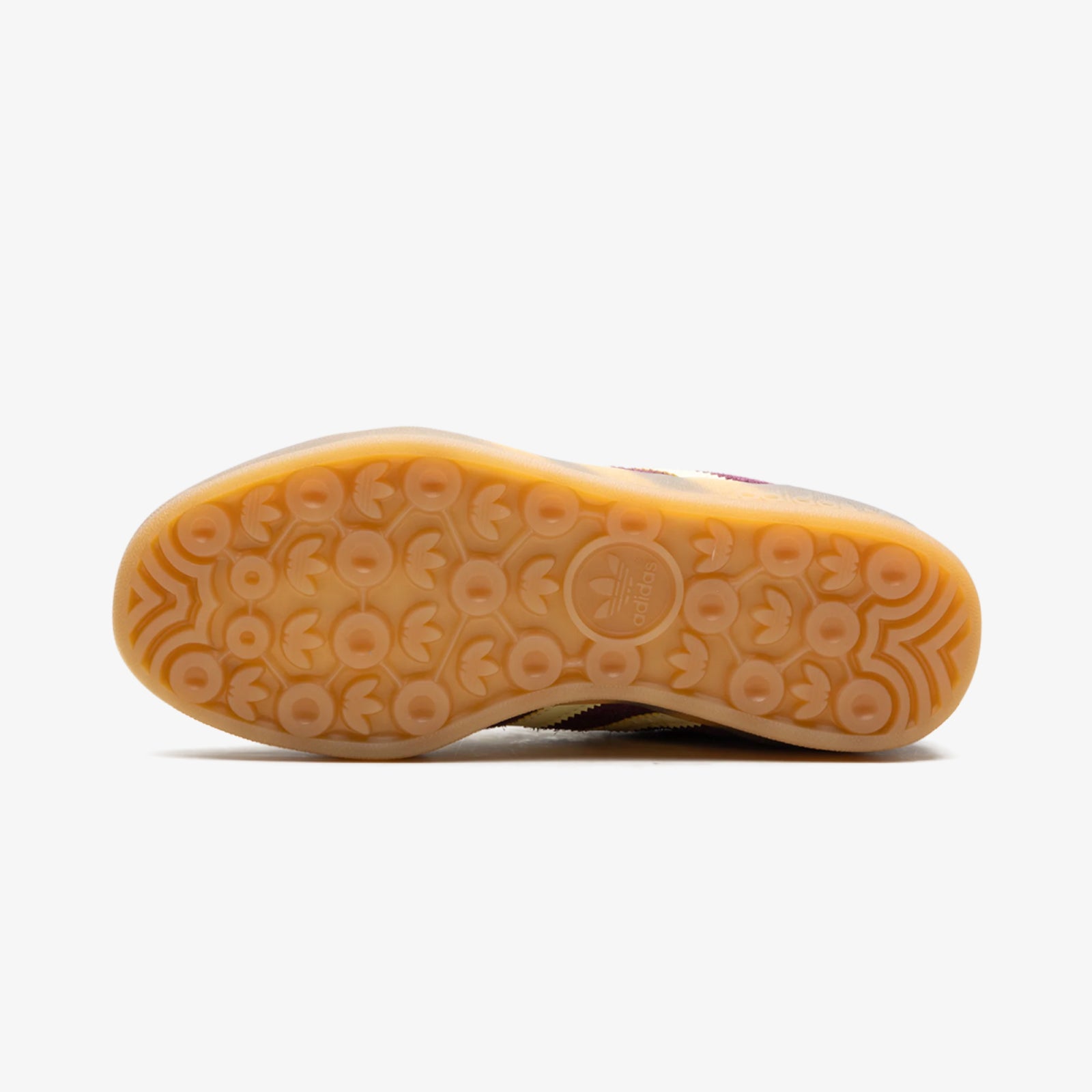The shoe rests on a classic translucent gum rubber sole that maintains the vintage vibe while providing reliable indoor traction. Gold-foil Gazelle branding on the side adds a touch of elegance. Designed for durability and comfort, the sneaker boasts a padded collar and cushioned midsole, making it ideal for all-day wear and versatile styling.