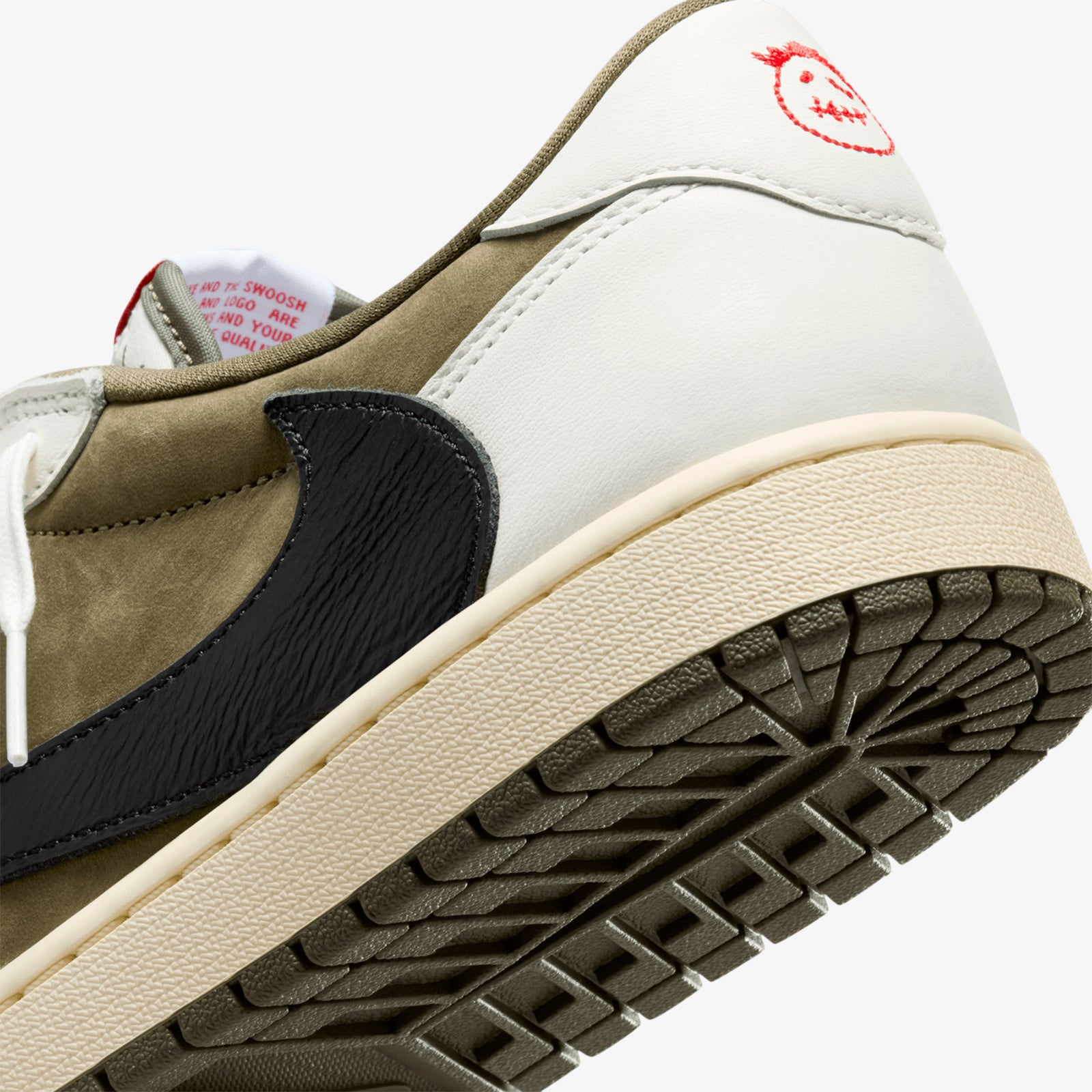 The Jordan 1 Retro Low OG SP Travis Scott Medium Olive represents a sophisticated evolution of the iconic Air Jordan 1, blending rugged utility with premium materials in a low-top design. Dominated by a Medium Olive suede base, this sneaker incorporates creamy sail leather overlays, delivering texture contrast and timeless appeal. Notably, the signature Travis Scott reversed Swoosh is embroidered in black on the lateral side, emphasizing the collaboration’s distinct identity.