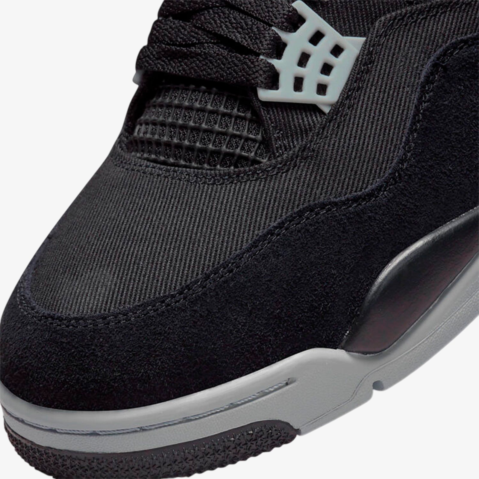 Released in September 2022, the Jordan 4 Retro SE Black Canvas offers a fresh reinterpretation of the classic silhouette with canvas uppers replacing traditional leather. The black canvas provides a durable, textured base, enhanced by tonal grey suede overlays on the toe box and grey molded eyelets. A subtle splash of fire red accents the midsole and Jumpman branding on the tongue and heel for a signature touch.