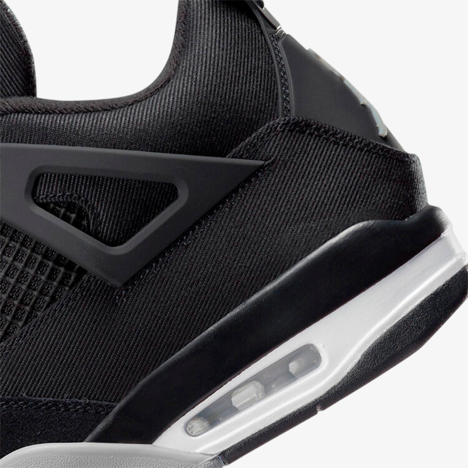 The midsole is made of rubber in black, white, and grey, while visible Air cushioning in the heel ensures comfort and performance. Unlike typical Jordan 4 versions, this edition features patch branding on the tongue and heel rather than embroidery, adding a contemporary edge to the design.