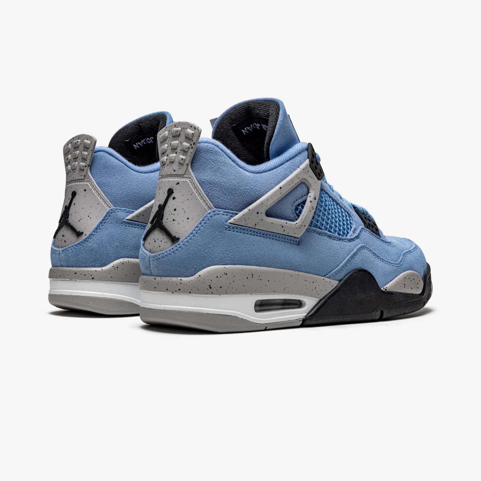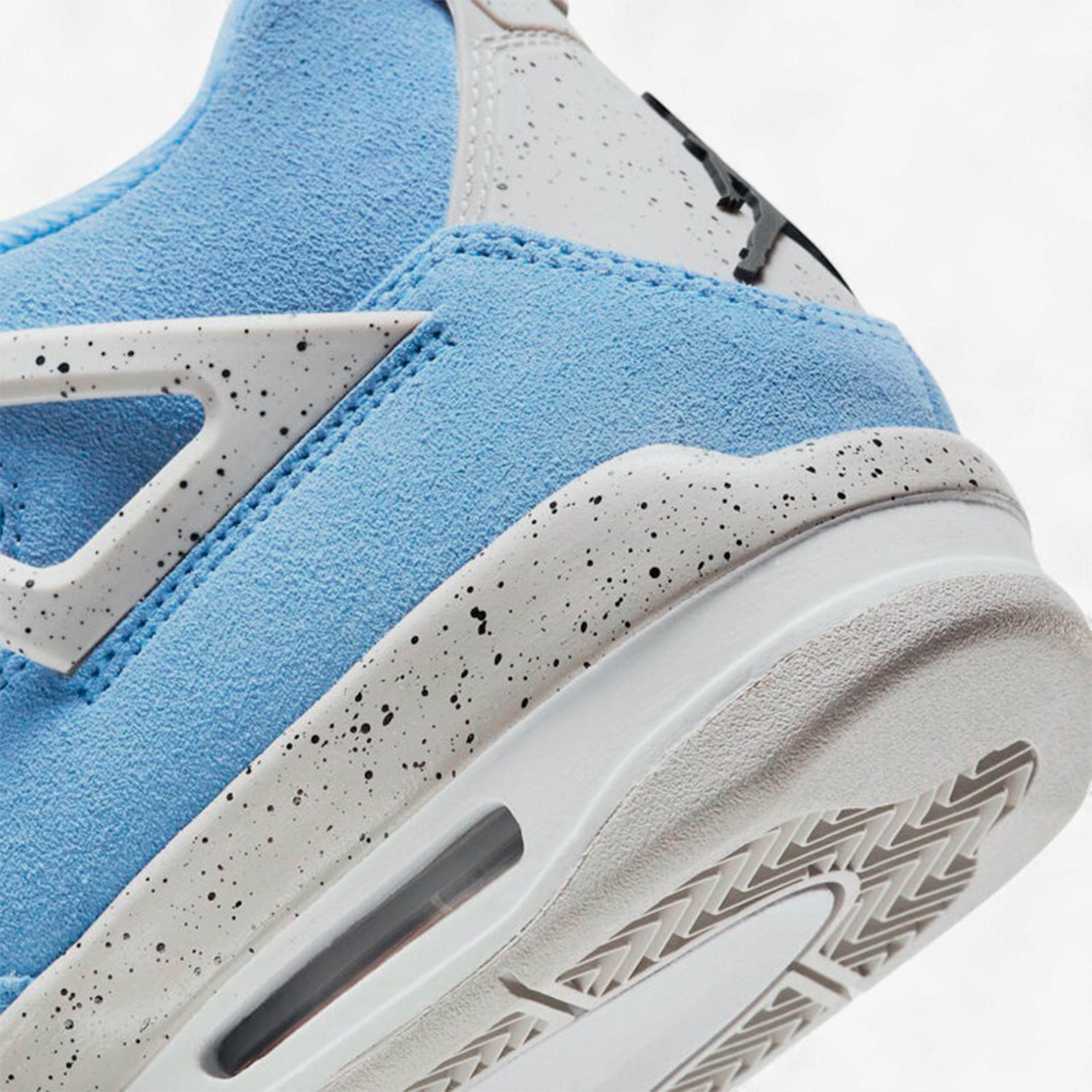 Released in April 2021, the Jordan 4 Retro University Blue pays tribute to Michael Jordan’s collegiate roots at the University of North Carolina. This edition showcases a premium university blue suede upper combined with Tech Grey and white overlays for contrast and depth. Black accents highlight the heel tab, eyelets, and outsole, while a speckled cement grey pattern adorns parts of the midsole and wings, adding a nostalgic nod to original Air Jordan 4 colourways.