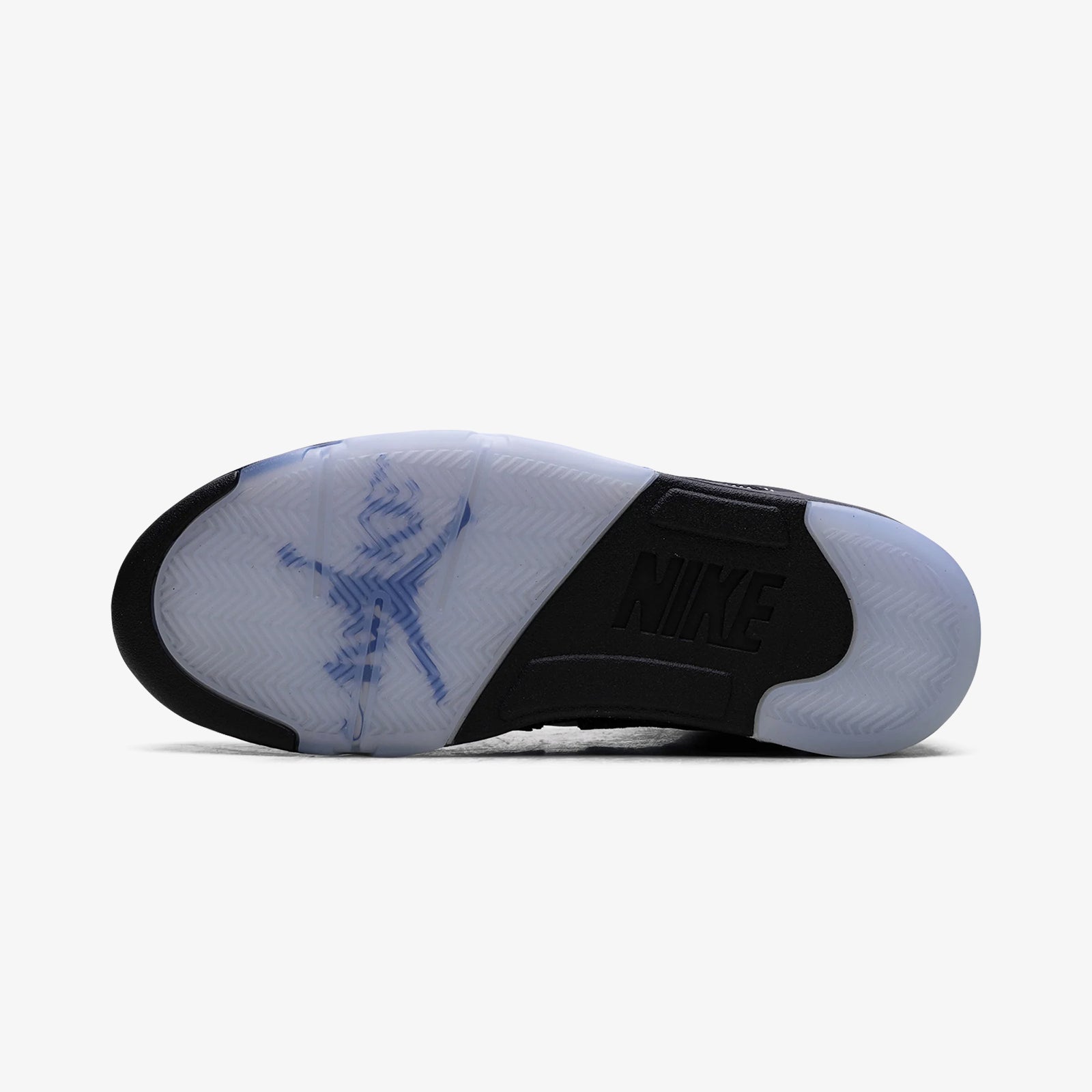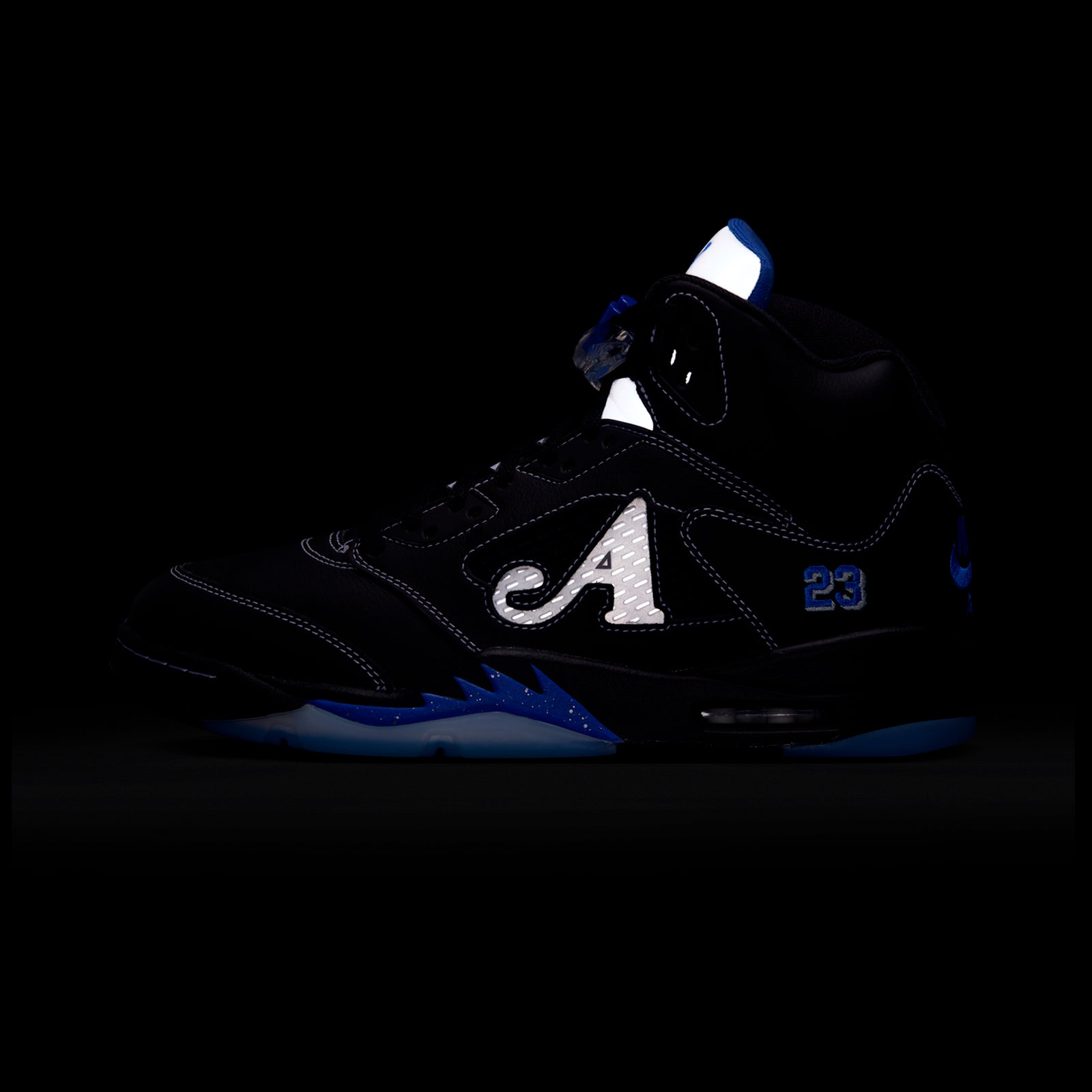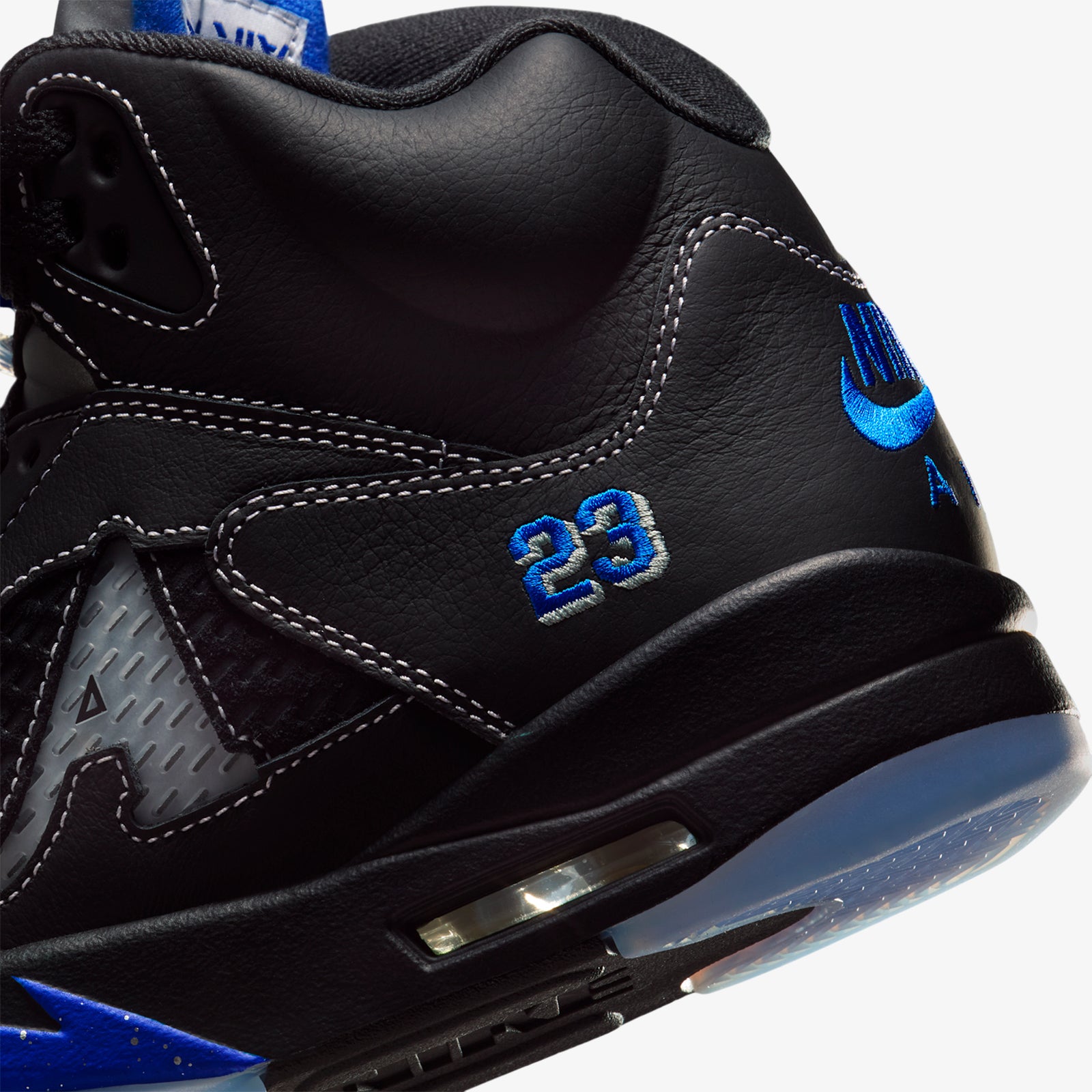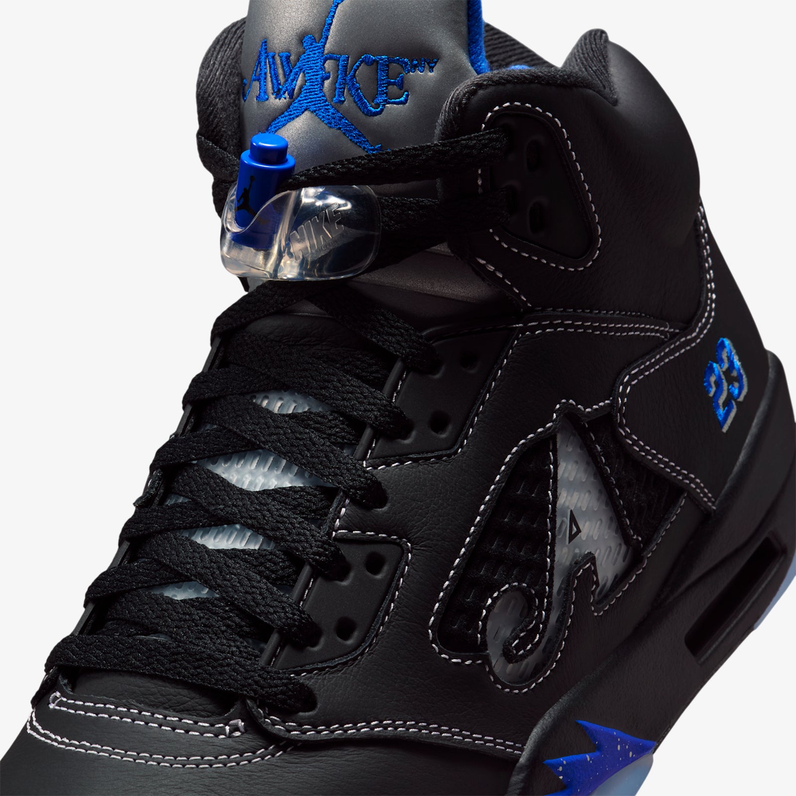 The Jordan 5 Retro Awake NY Black represents a powerful collaboration between Jordan Brand and Awake NY, paying homage to New York City's vibrant culture. This sneaker features a premium black tumbled leather upper with white contrast stitching that outlines the iconic Air Jordan 5 silhouette. Racer Blue accents provide vibrant pops of colour on the jagged midsole "shark teeth," lace locks, and tongue branding, blending classic design with contemporary flair.