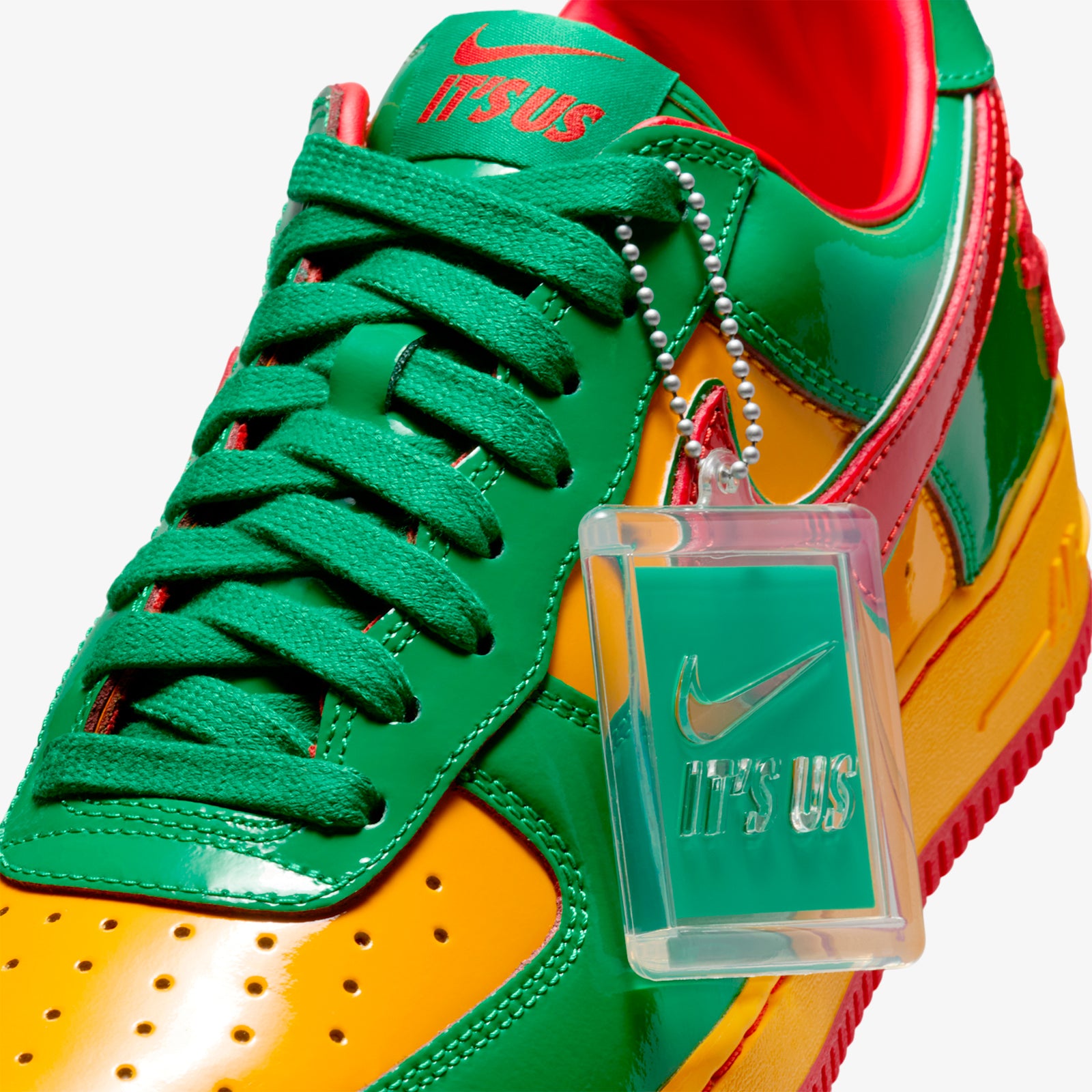 The Nike Air Force 1 Low Lil Yachty Concrete Boys Lucky Green pairs bold patent leather with vivid university hues and unique Concrete Boys branding.