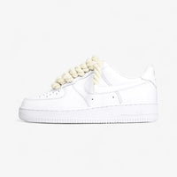 The Nike Air Force 1 Low Rope Laces White reinterprets the timeless silhouette with a bold, custom touch tailored for the modern sneaker enthusiast. This edition features the classic triple white premium leather upper, now elevated with chunky rope-style laces in white or natural tones, adding a unique blend of volume and textural contrast. Each pair is meticulously hand-customised, making every sneaker distinct and exclusive.