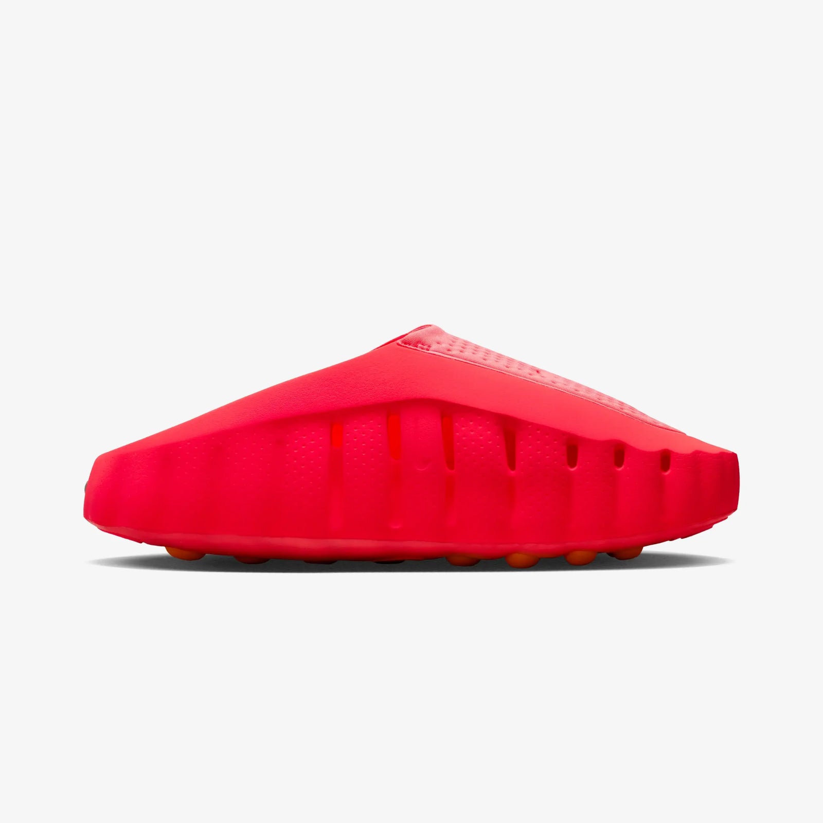 The Nike Mind 001 Slide Solar Red pushes the Mind concept into full statement mode, wrapping its neuroscience-inspired tooling in a vivid Solar Red/Hyper Crimson/Black/Chrome palette. The upper, midsole and sidewalls arrive in a saturated red tone, set off by reflective chrome Swooshes and black hits that emphasise its experimental, almost sci‑fi profile. Designed as a pregame and recovery slide, it keeps the same sleek mule shape and perforated, flexible build that fits easily into everything from training sets to track pants and shorts.