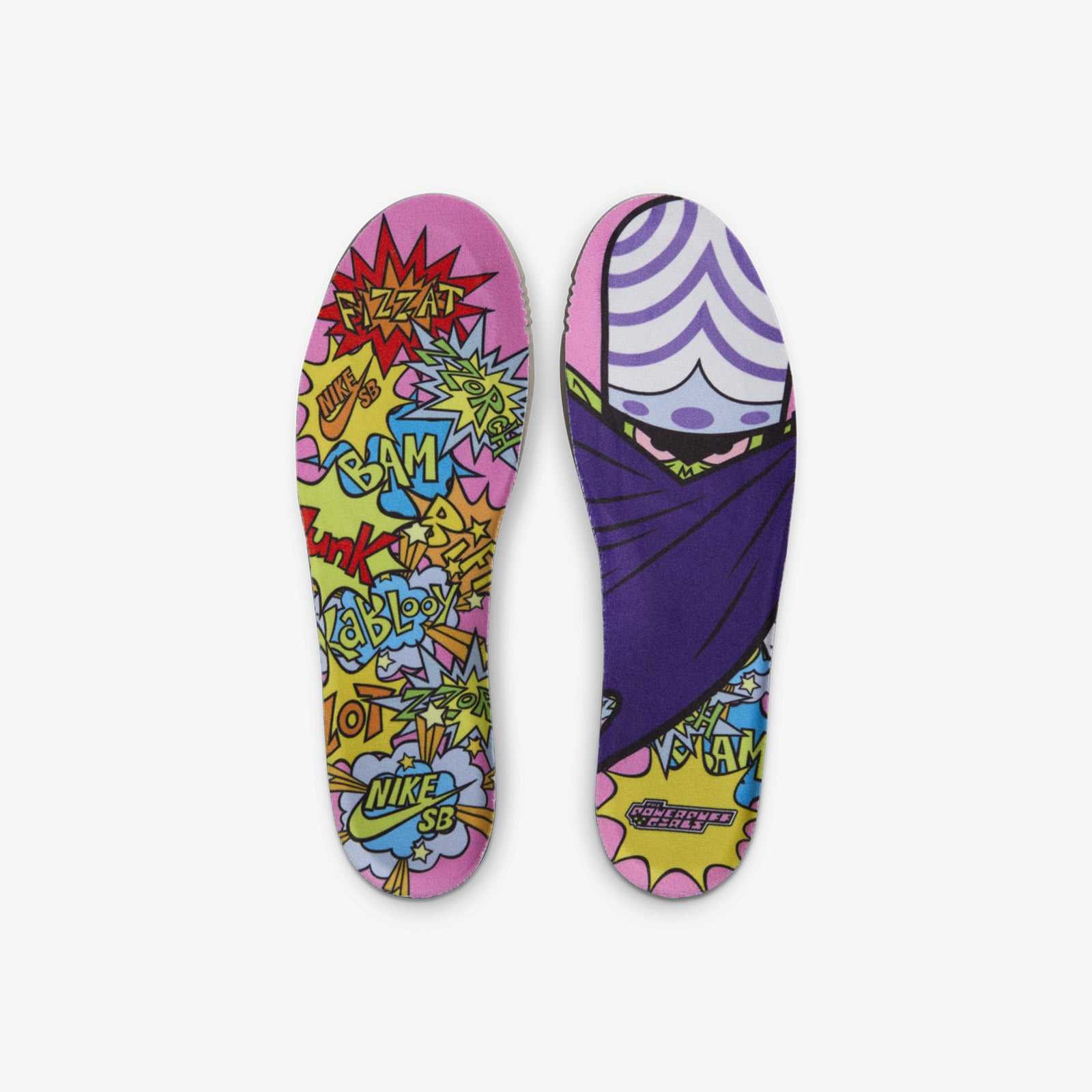 Embroidered pink laser eyes on the heel, reflective piping, and jacquard detailing enhance the design while a translucent icy outsole boosts style and performance. Inside, comic-inspired insoles pay homage to classic characters, including the notorious Mojo Jojo, completing the playful narrative of this skate-ready sneaker.