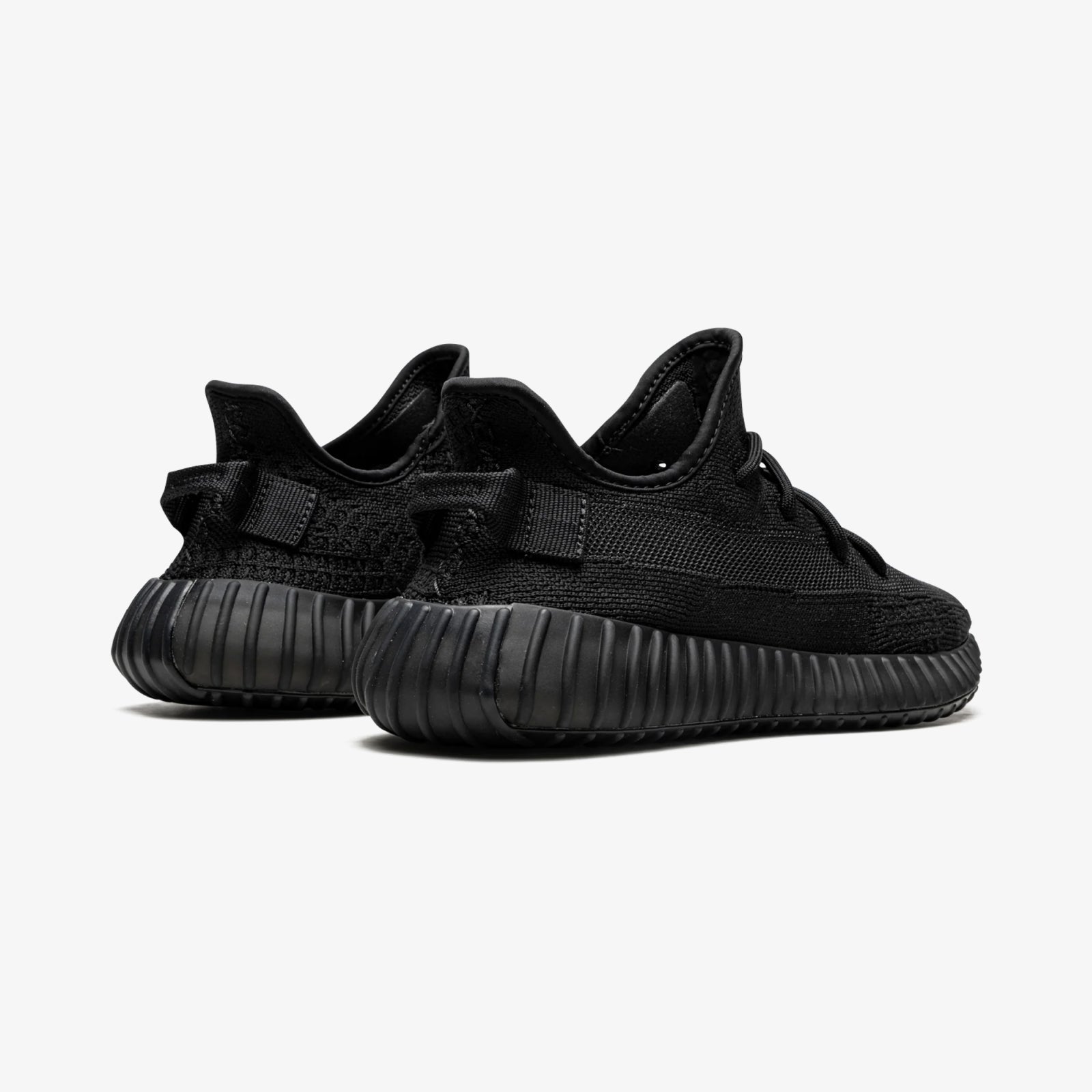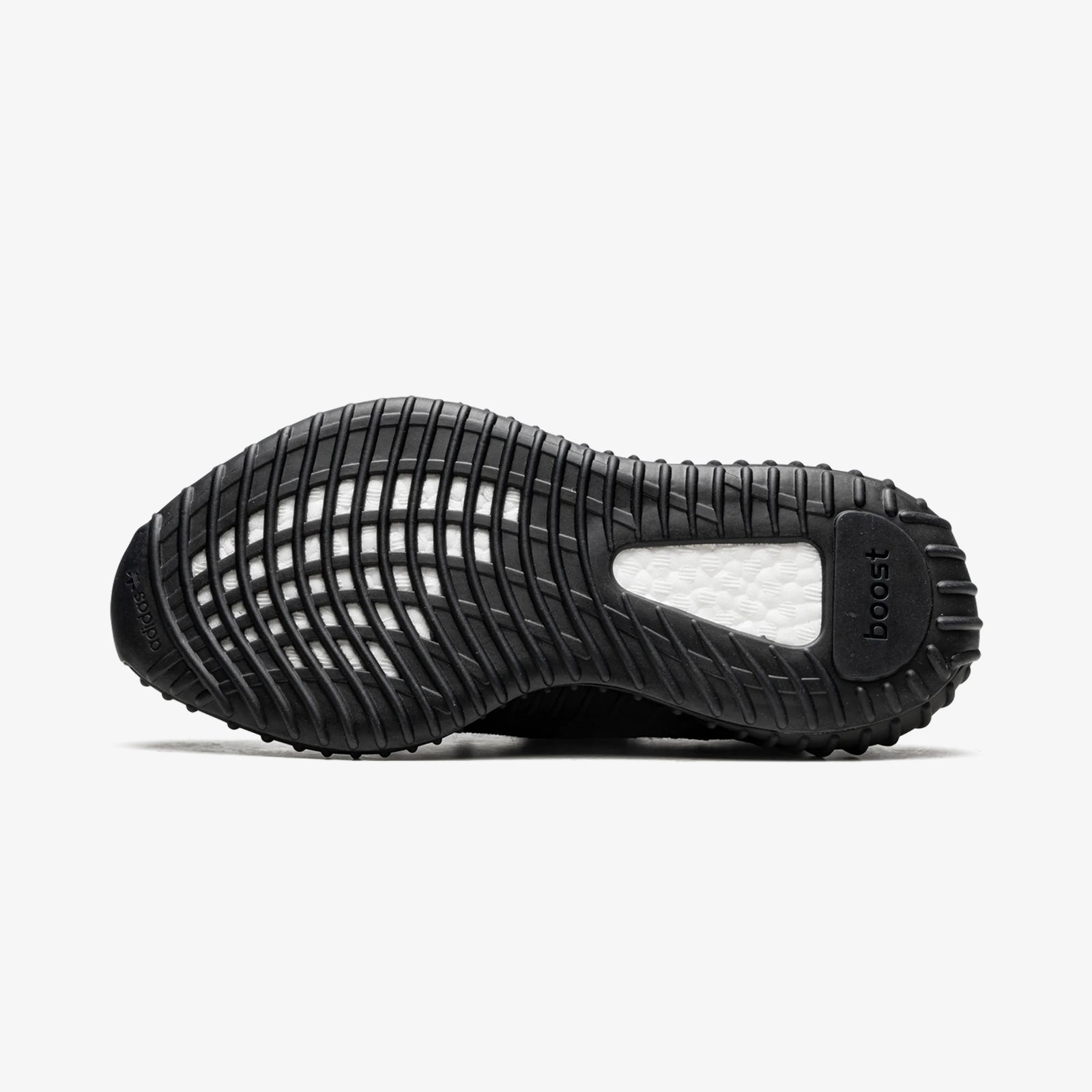 Sapatilha preta monocromática em Primeknit com entressola Boost e gaiola TPU—conforto Yeezy aliado a estilo minimalista.