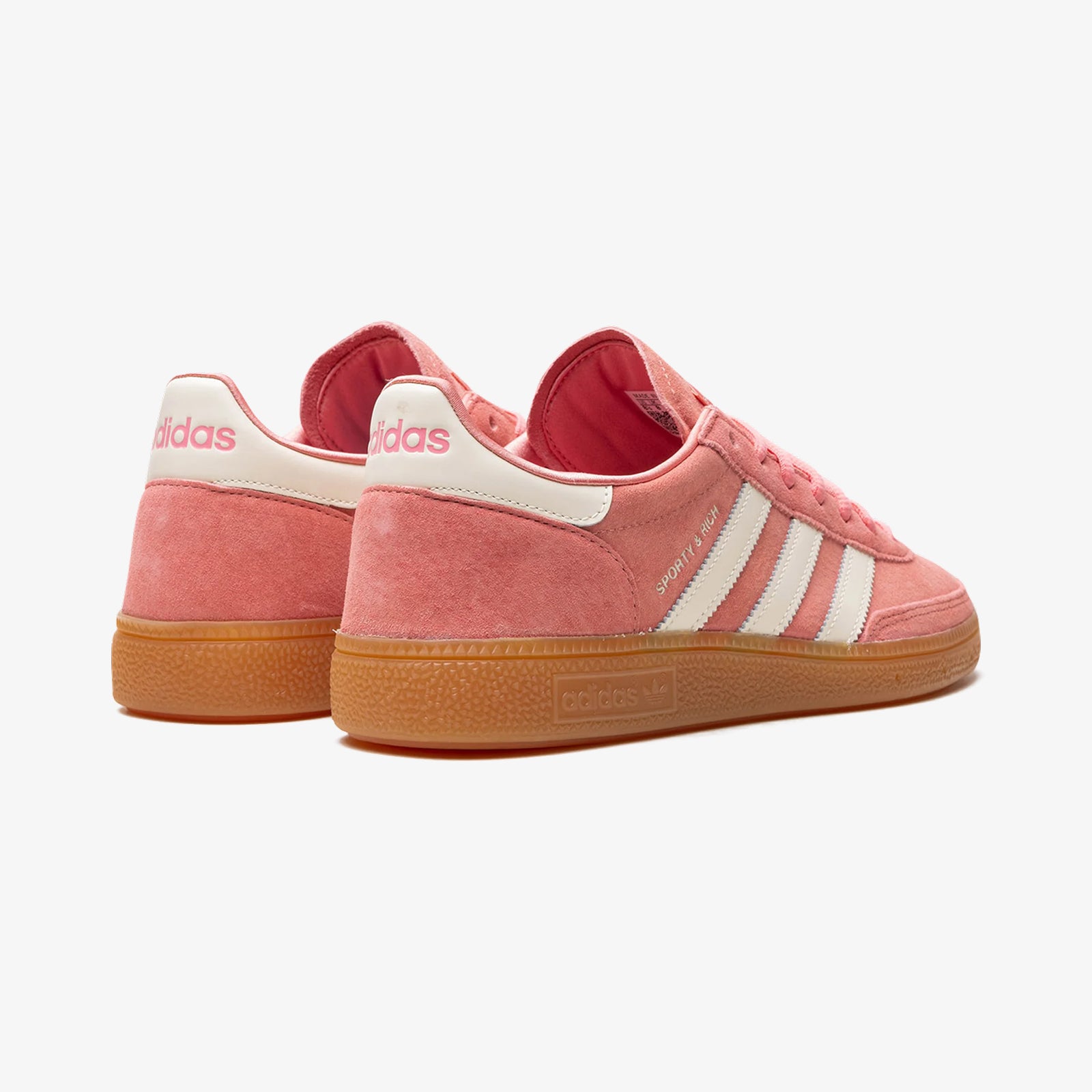 A adidas Handball Spezial Sporty & Rich Pink, lançada em maio de 2024, propõe uma reinterpretação refinada da clássica silhueta Handball Spezial com uma abordagem suave e feminina. Confeccionada em camurça rosa premium, esta versão traz detalhes em couro branco creme nas três riscas serrilhadas e no calcanhar, complementados por atacadores rosa vibrantes que adicionam energia divertida. A sola em borracha gum completa o design, proporcionando durabilidade e aderência inspirada nos courts vintage.