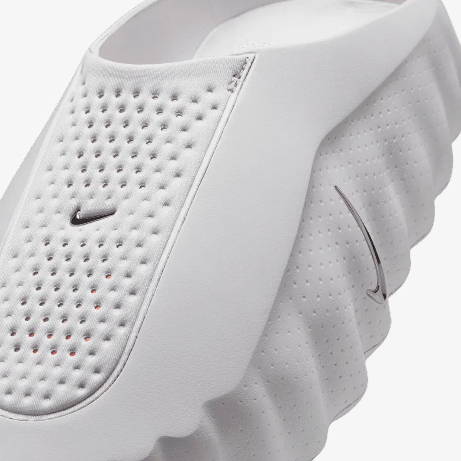 As Nike Mind 001 Slide Light Smoke Grey inauguram a silhueta Mind 001 com uma abordagem minimalista e quase meditativa ao calçado de recuperação, pensadas para os momentos antes e depois do treino. A paleta Light Smoke Grey/Photon Dust/Hyper Crimson/Chrome cria uma base monocromática em cinzento claro que se estende do upper à entressola e à sola, realçada por um toque laranja Hyper Crimson na zona inferior e por um Swoosh lateral em Chrome que acrescenta um brilho futurista. As linhas esculturais, a construção em duas partes e o cabedal perfurado e respirável sublinham um design limpo, fácil de integrar tanto em coordenados de streetwear como em contextos de ginásio.